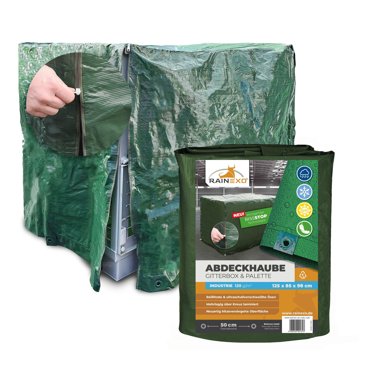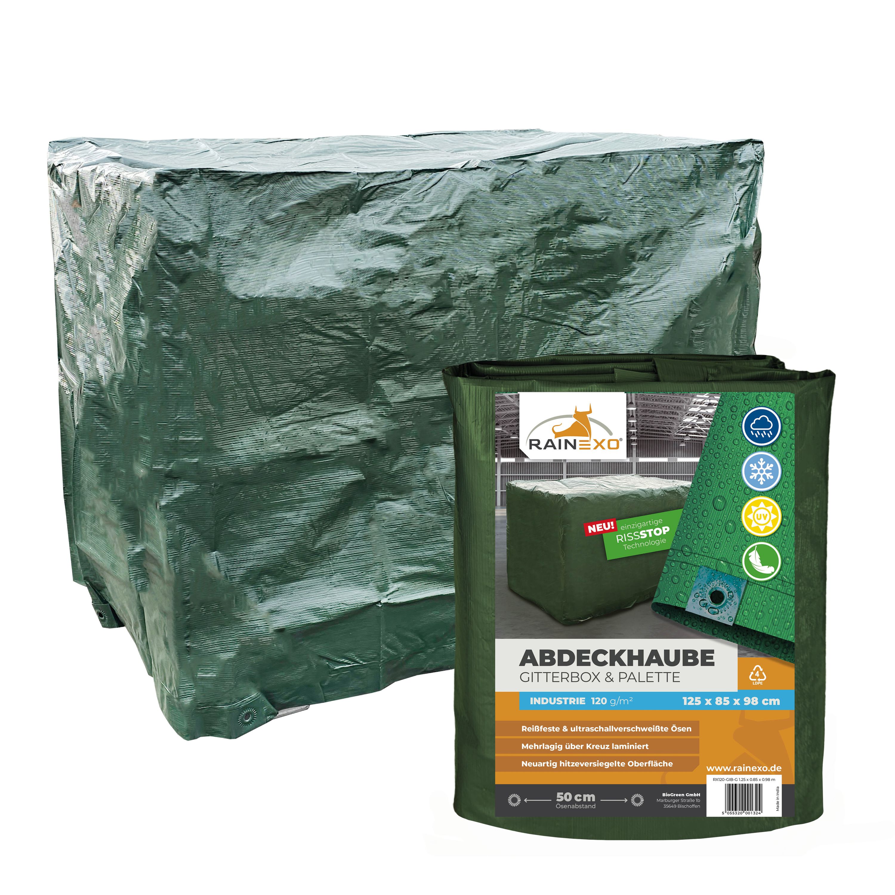 Abdeckhaube für Gitterbox 120g/m² Grün, optional mit Reißverschluss, 125x85x98cm