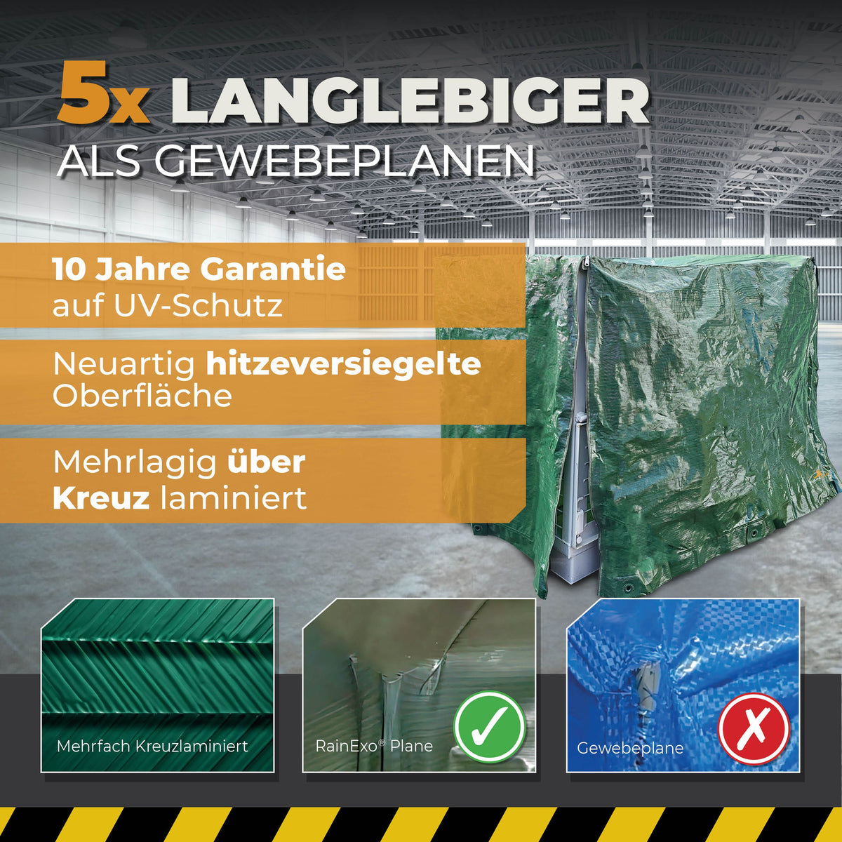 • Längere Haltbarkeit: Hält bis zu 7-mal länger als normale Planen und spart auf lange Sicht Kosten.