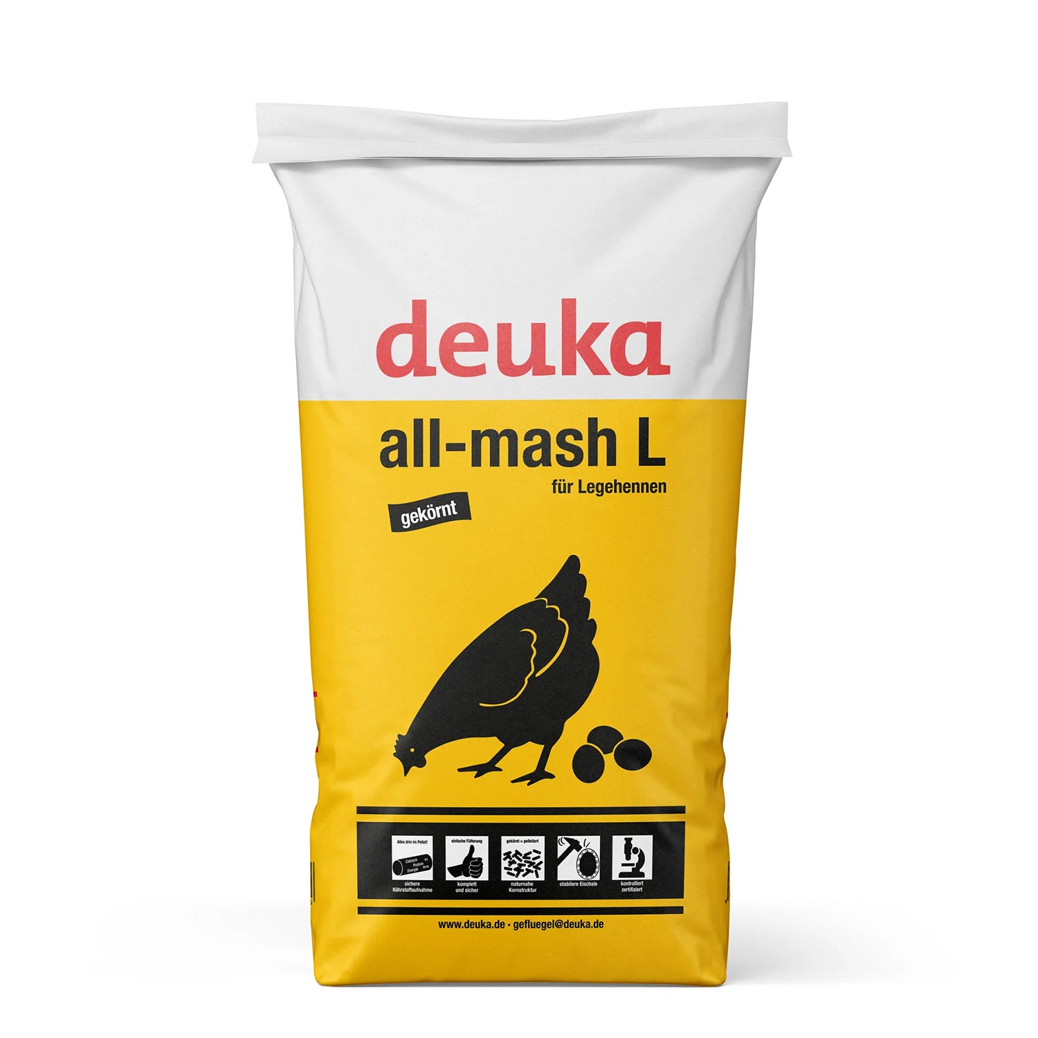 deuka all-mash L in Pelletform ist ein hochwertiges Alleinfutter für Legehennen ab Beginn der Legetätigkeit. Die 3 mm-Pellets sichern eine gleichmäßige, verlustfreie Futteraufnahme und verhindern ein selektives Fressverhalten. Damit ist das Futter besonders effizient und sorgt für eine optimale Versorgung der Hennen mit allen wichtigen Nährstoffen.