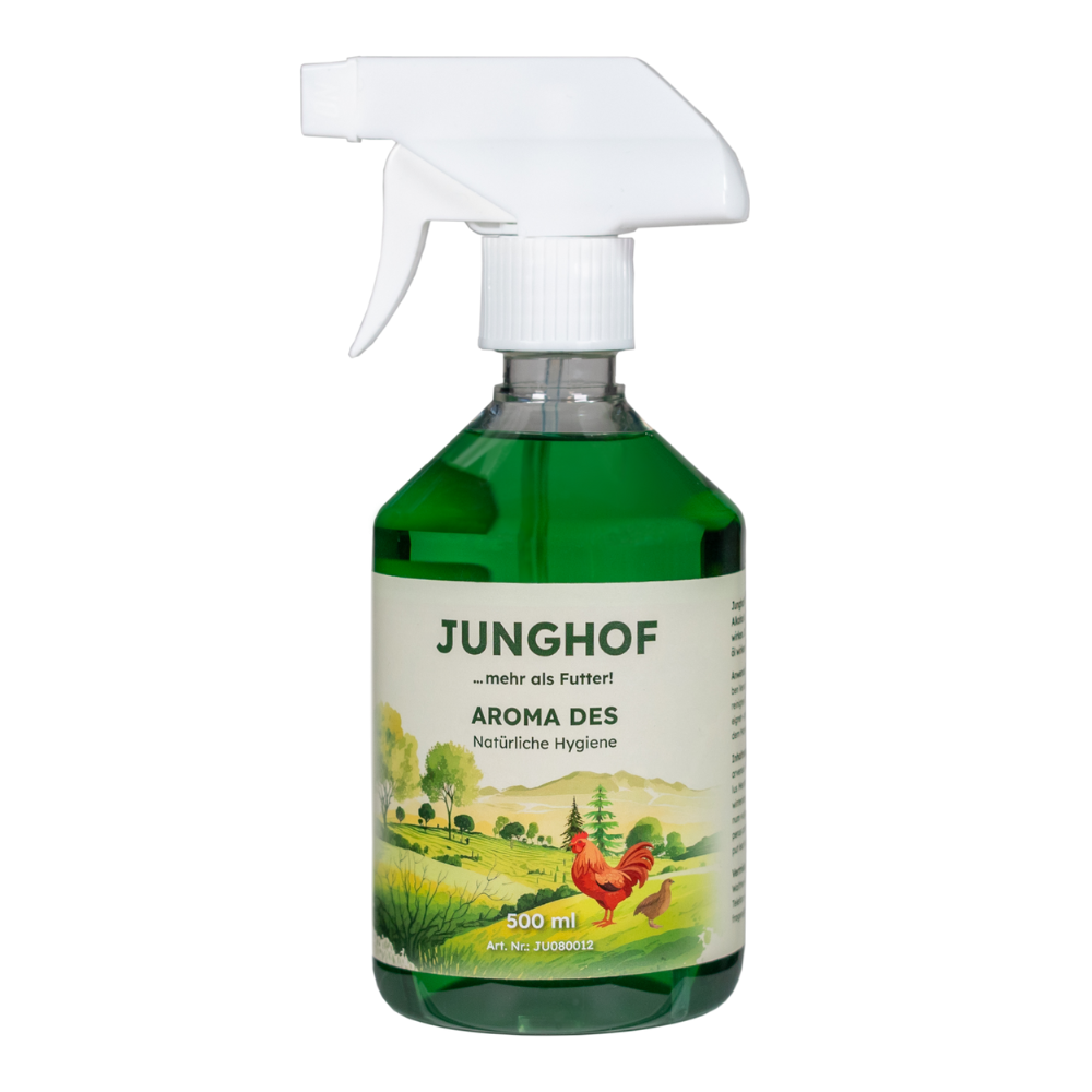 Aroma Des ist ein flüssiges Hygieneprodukt zur Anwendung nach der Grundreinigung des Stalls. Durch den enthaltenen Alkohol sowie die ätherischen Öle von Minze und Eukalyptus kann es zur Reduzierung unerwünschter Keime beitragen und gleichzeitig die Stallluft verbessern. Die Zusammensetzung ist für viele Oberflächen geeignet, einschließlich Holz.