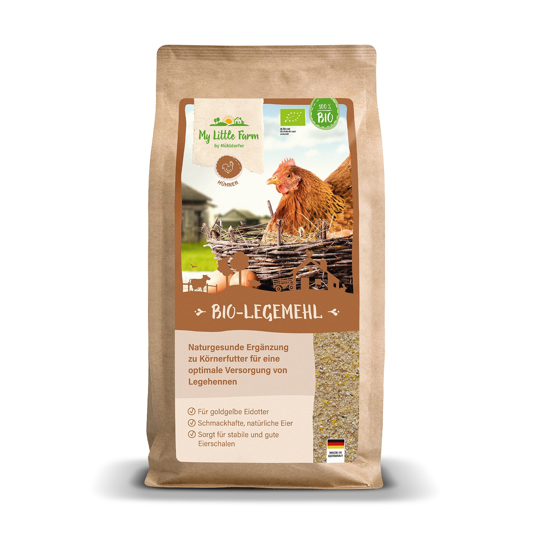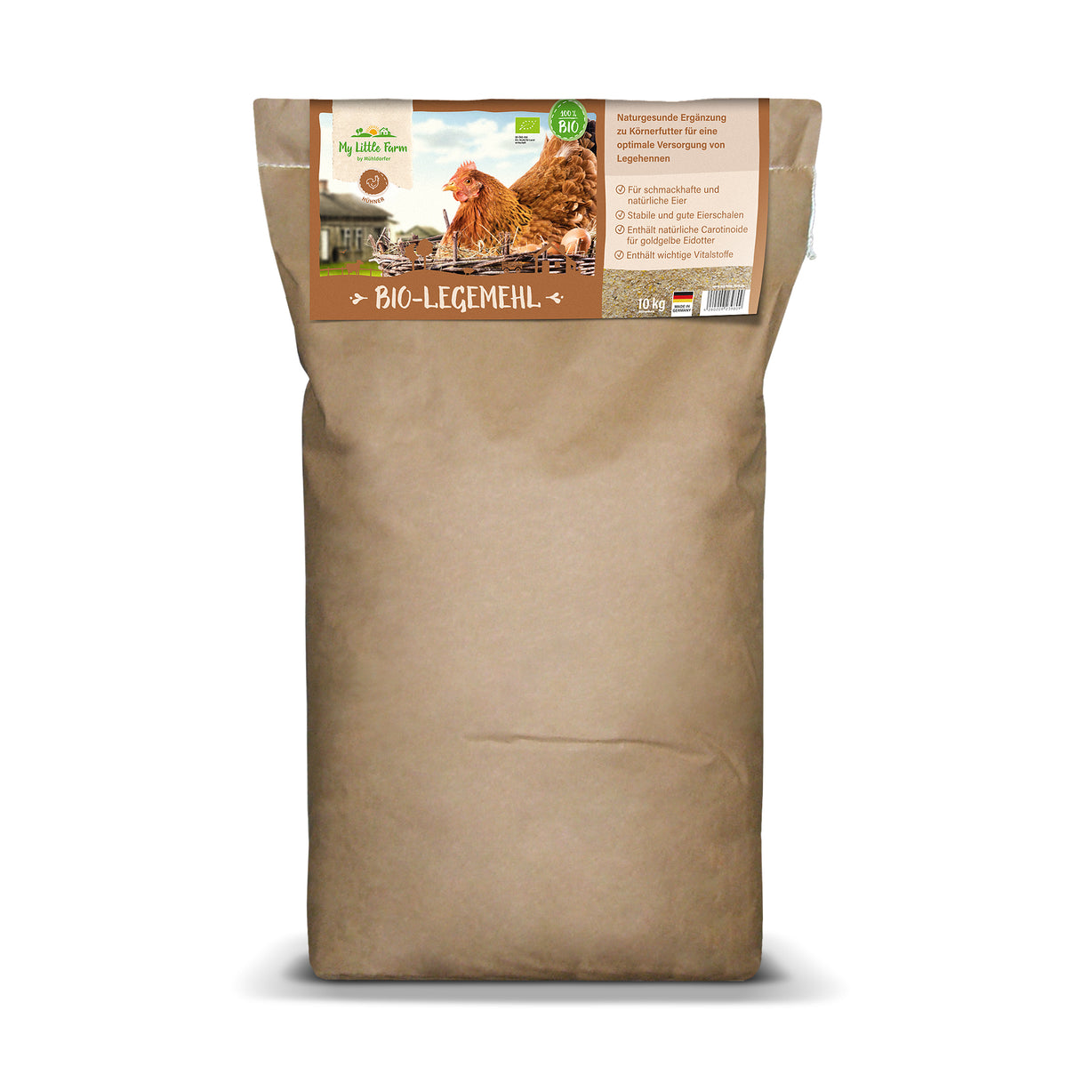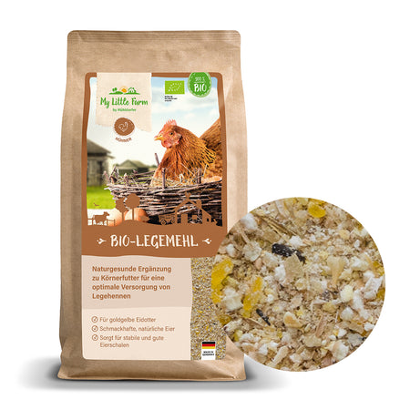 Unser Bio-Legemehl ist ein hochwertiges Alleinfutter für Legehennen — sorgfältig komponiert aus Zutaten kontrolliert biologischen Ursprungs. Es verbindet gute Verdaulichkeit mit Leistungsfähigkeit und unterstützt stabile Schalenqualität sowie einen kräftigen Dotter.