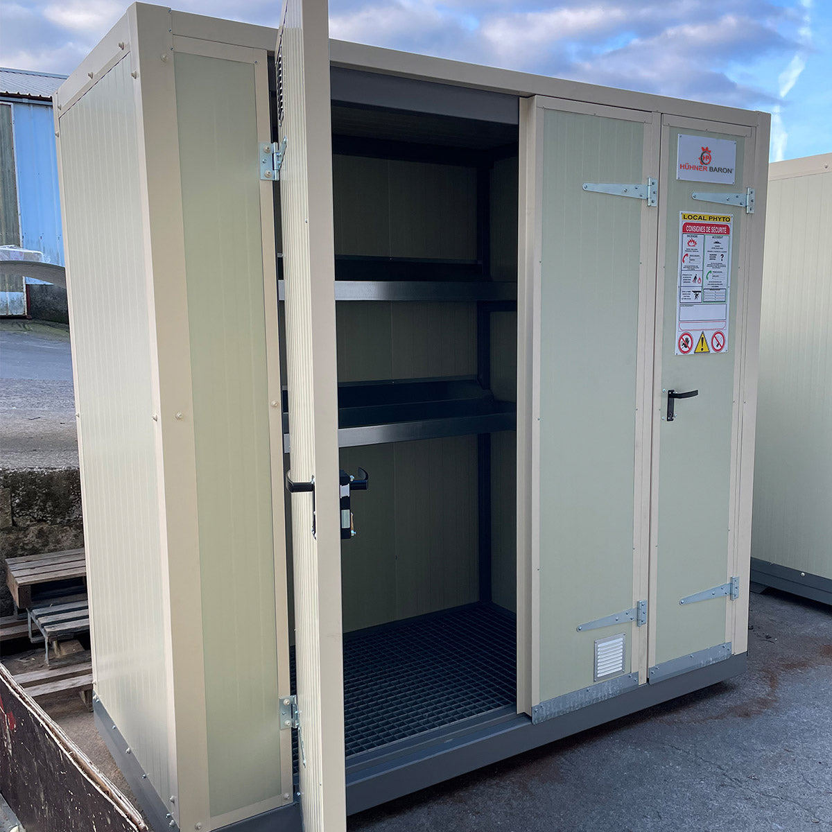 Das PHYTO-Gebäude ist ein vollständig montiertes Lager für Pflanzenschutzmittel, Chemikalien oder andere Gefahrstoffe. Die robuste, geschweißte Stahlstruktur in Kombination mit 40 mm starken Isolierpaneelen sorgt für hohe Stabilität, gute Wärmedämmung und eine pflegeleichte Oberfläche. Ein integriertes Regalsystem und eine Bodenwanne mit Rückhaltekante gewährleisten eine sichere, vorschriftskonforme Lagerung. Das Gebäude wird betriebsfertig geliefert und ist in vier Größen erhältlich, um verschiedenen Anforderungen gerecht zu werden.