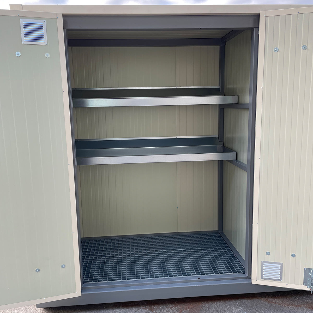Das größte Modell bietet großzügige Lagerkapazität für umfangreiche Bestände oder kombinierte Nutzung als Lager- und Mischraum. Optimal geeignet für größere Betriebe mit erhöhtem Sicherheitsbedarf und umfangreichem Pflanzenschutzsortiment.