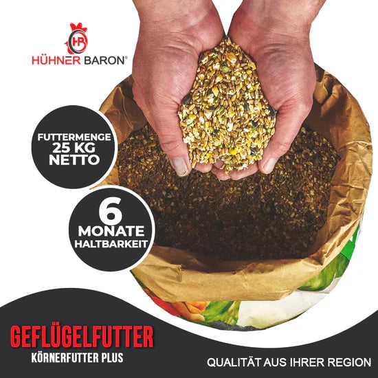Unser Hühner Körnerfutter GOURMET ist eine hochwertige Mischung aus regionalen Rohstoffen, die von einem unabhängigen Labor ständig auf Reinheit überprüft werden. Die schonende Verarbeitung aller Komponenten sorgt für konstante Qualität und eine absolut gesunde und natürliche Fütterung Ihrer Hühner. Unsere Mischung beinhaltet Weizen, Mais gebrochen, Erbsenbruch grün, Sonnenblumenkerne, Milo und Calciumcarbonat (aus Austernschalen). Diese Zutaten wurden zu einer leicht verdaulichen Kombination zusammengemischt und bieten Ihren Hühnern eine reichhaltige Ernährung an Vitaminen, Mineralstoffen und Aminosäuren. Mit dem Hühner Körnerfutter GOURME" sichern Sie Ihren Tieren den bestmöglichen Gesundheitszustand!