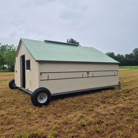 Mit 150 m² bietet der Stall Platz für bis zu 900 Hühner in Biohaltung oder 1.350 Hühner in Freilandhaltung. Die großzügige Stallfläche schafft ideale Bedingungen für Bewegungsfreiheit, Sozialverhalten und strukturierte Bereiche. Durch die mobile Konstruktion bleibt der Boden geschont, die Grasnarbe regeneriert sich schnell und die Tiere profitieren von frischem Futter im Auslauf.