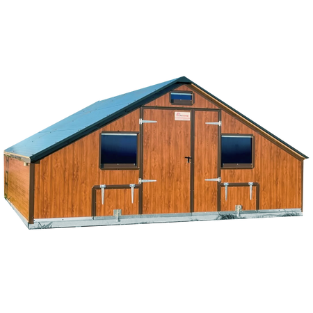 Der stabile Stahlrahmen (100 × 100 mm, 3 mm Wandstärke) und die isolierten Sandwichpaneele (40 mm) aus verzinktem Stahlblech sorgen für Witterungsbeständigkeit und Langlebigkeit. Das 30° geneigte Dach gewährleistet eine effiziente Wasserableitung, während die durchgehenden Paneele ein dichtes, zugfreies Stallklima schaffen – auch im Winter.