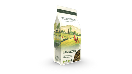 Landkorn ist eine ausgewogene, strukturreiche Körnermischung aus verschiedenen Getreidearten und Ölsaaten. Sie ergänzt Legemehl oder Legekorn ideal und kann zur täglichen Fütterung eingesetzt werden. Durch das zugesetzte Leinöl bleibt das Futter staubfrei und wird hervorragend angenommen. Geeignet als frei verfügbarer Beifutteranteil oder als abwechslungsreiche Beschäftigungsfütterung.