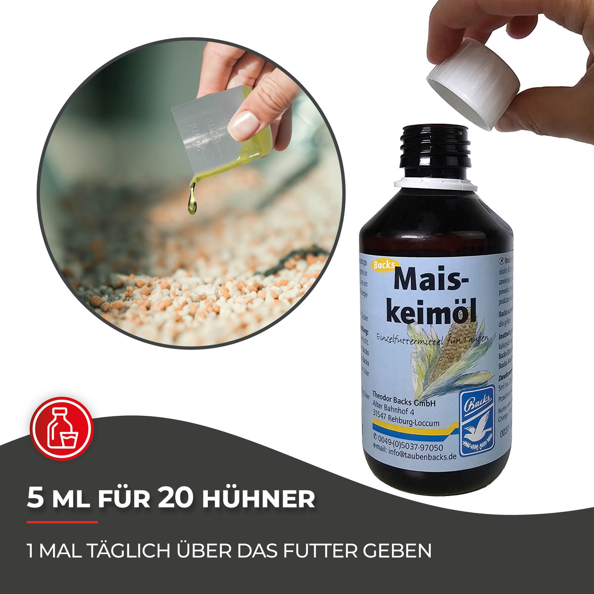 Backs Maiskeimöl wird einfach unter das tägliche Futter gemischt. Für eine optimale Wirkung, besonders während der Legeperiode oder in stressigen Zeiten, empfehlen wir die Kombination mit einem hochenergetischen Zusatz wie Backs Extra Energie. Dies unterstützt nicht nur die Vitalität, sondern fördert auch die allgemeine Gesundheit der Hühner.