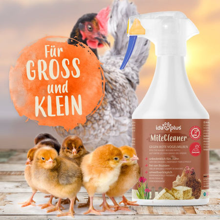 MiteCleaner ist einfach anzuwenden: Dank der praktischen Sprühflasche lassen sich die behandelten Flächen schnell und effizient einsprühen. Das Produkt ist umweltverträglich, frei von Bioziden und schädlichen Chemikalien und somit unbedenklich für die Gesundheit der Hühner.