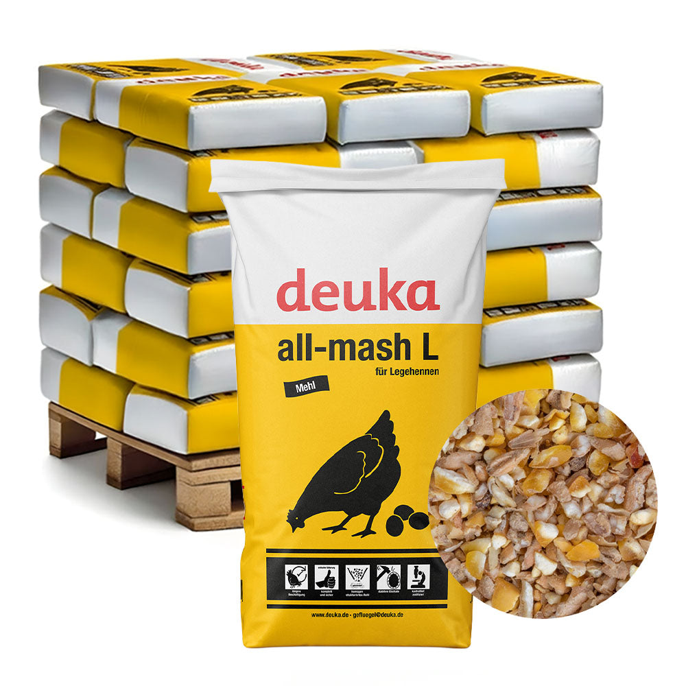 deuka all-mash L ist ein hochwertiges Alleinfutter für Legehennen ab Beginn der Legetätigkeit. In homogener Mehlform bietet es eine ausgewogene, vollwertige Ernährung, die alle Nährstoffbedürfnisse von Legehennen abdeckt. Das strukturierte Mehl fördert das natürliche Pickverhalten der Hennen und sorgt für eine artgerechte Beschäftigung während der Futteraufnahme.