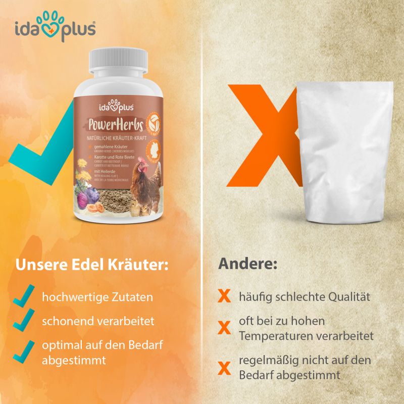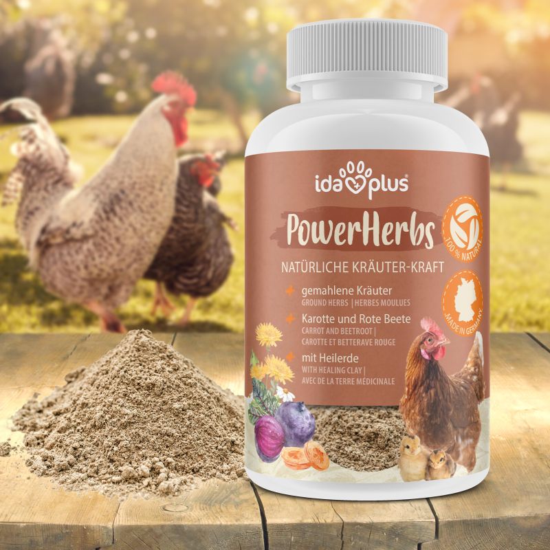 IdaPlus® PowerHerbs ist ein hochwertiges, natürliches Ergänzungsfuttermittel, das speziell entwickelt wurde, um die Gesundheit und das Wohlbefinden von Geflügel zu unterstützen. Die fein gemahlenen Kräuter bestehen aus einer kraftvollen Mischung von Heilerde, Karotten und Roter Beete, die den Verdauungstrakt fördern und die Enzymbildung im Körper der Tiere anregen.