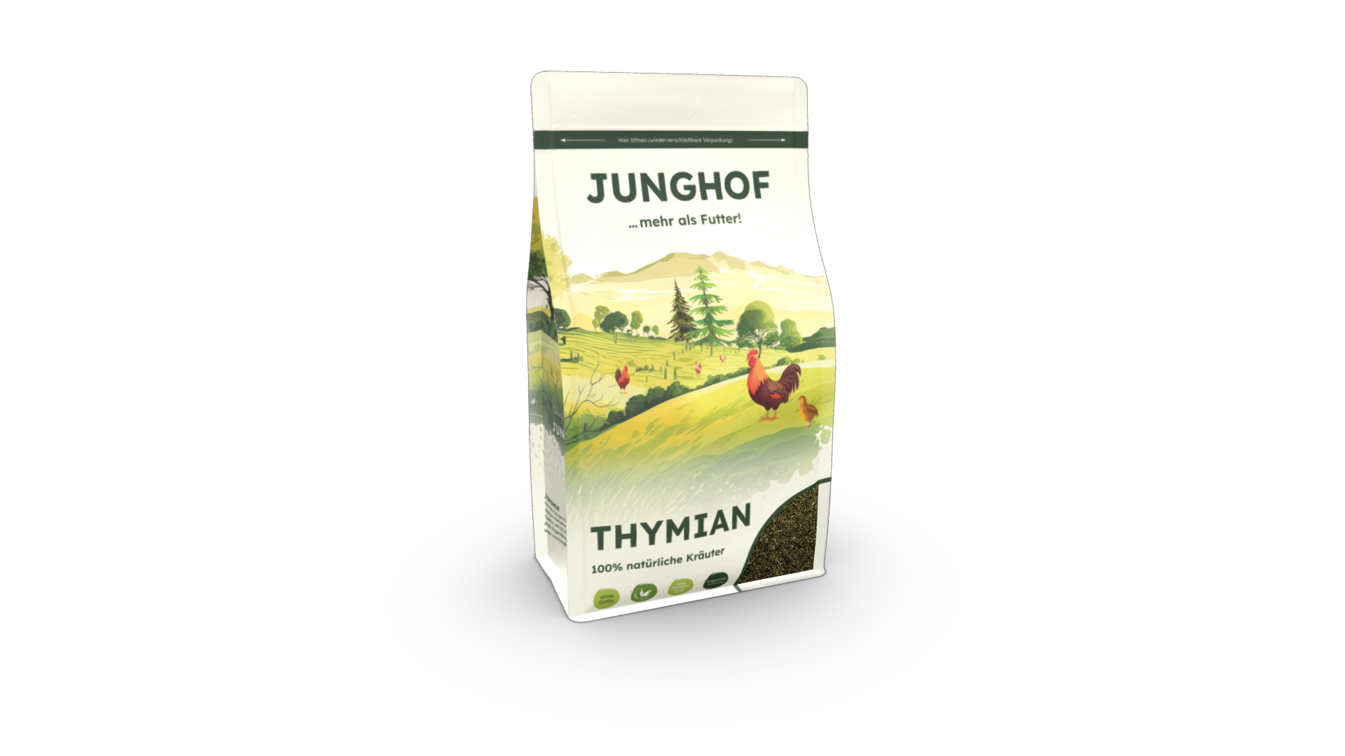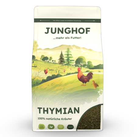 Thymian ist eine naturbelassene Futterergänzung, die auf natürliche Weise den Organismus von Geflügel unterstützen kann. Das enthaltene Thymol kann die Abwehrkräfte fördern und dabei helfen, den Organismus in der kalten Jahreszeit zu unterstützen. Besonders während Herbst- und Wintermonaten kann Thymian als Futterergänzung dazu beitragen, die Vitalität der Tiere zu erhalten. Die Anwendung ist einfach: Thymian kann direkt unter das tägliche Futter gemischt werden und ist für Tiere jeden Alters geeignet.
